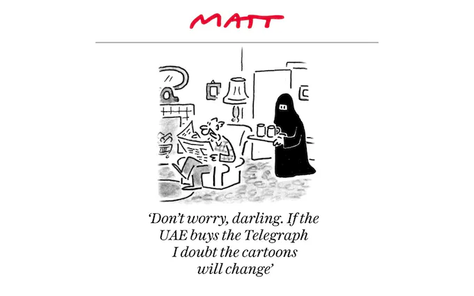 In the cartoon, printed at a time when controversy surrounded attempts by an Abu Dhabi-backed investment fund to buy The Telegraph amid fears the United Arab Emirates would use the newspaper to wield influence, the husband says to his wife, dressed in a burka, “Don’t worry, darling. If the UAE buys The Telegraph I doubt the cartoons will change.”