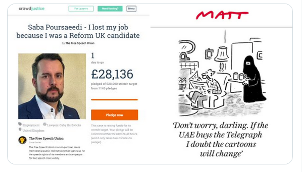 A huge thank you to the 1,145 people who donated — your support sends a powerful message: political discrimination at work will not go unchallenged. Former housing officer @ReformSaba lost his job over his links to @reformparty_uk and for reposting a cartoon from The Telegraph — a satirical piece by award-winning cartoonist Matt Pritchett, known for his light-hearted humour.